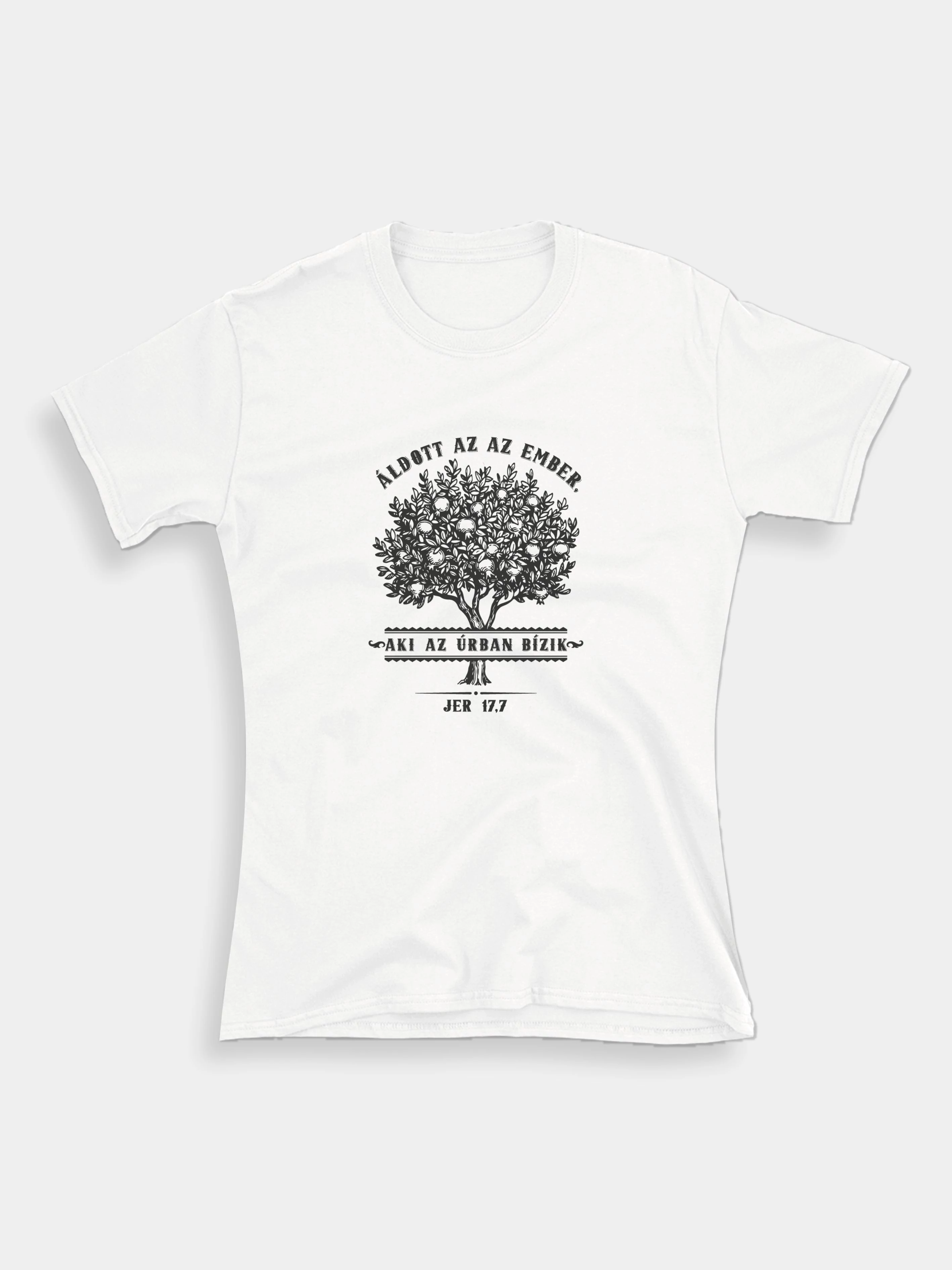 Női póló magyar felirattal, egy gránátalmafa mintájával.