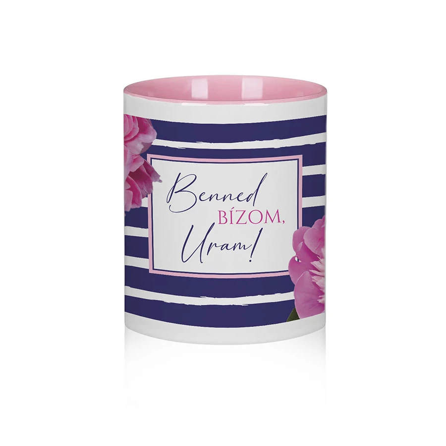 Kerámiabögre „Benned bízom, Uram!” felirattal, rózsaszín belsővel.