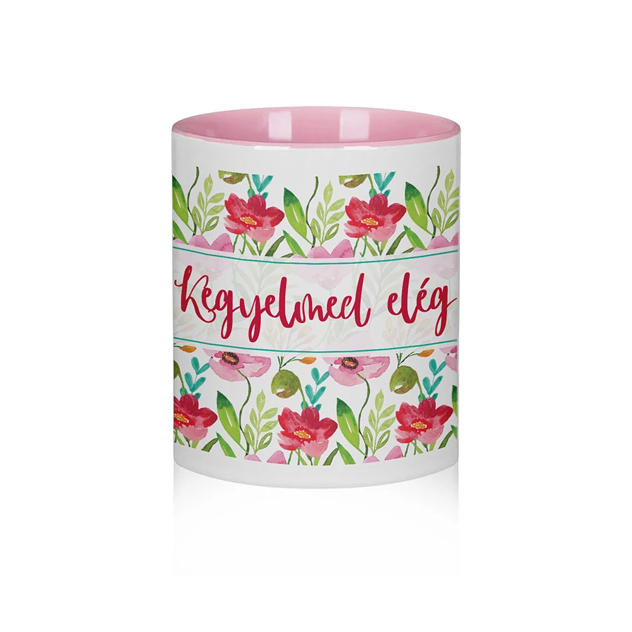 Kerámiabögre „Kegyelmed elég” felirattal, szép virágmintával, rózsaszín belsővel.