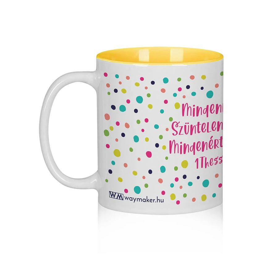 Kerámiabögre „Mindenkor örüljetek! Szüntelen imádkozzatok! Mindenért hálát adjatok...” 1Thesszalonika 5,16–18 felirattal, vidám sárga belsővel.