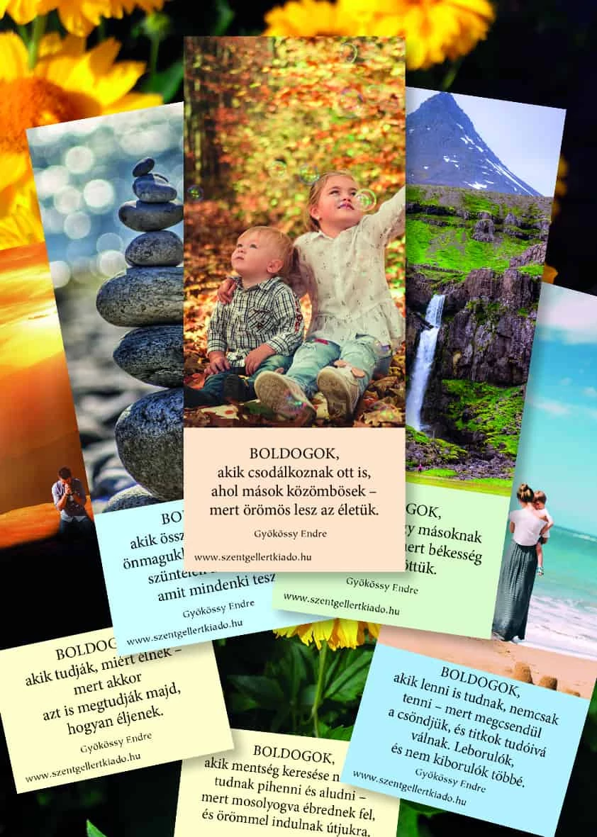 15 ragyogó, színes ajándékkísérő vagy könyvjelző Gyökössy Endre híres boldogmondásai alapján: