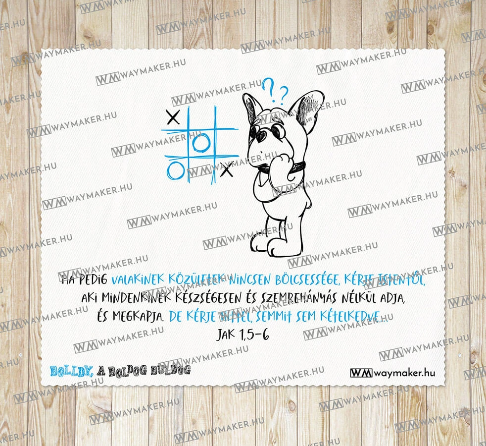 Felirat: „Ha pedig valakinek közületek nincsen bölcsessége, kérje Istentől, aki mindenkinek készségesen és szemrehányás nélkül adja, és megkapja. De kérje hittel, semmit sem kételkedve… – Jak 1,5–6”.