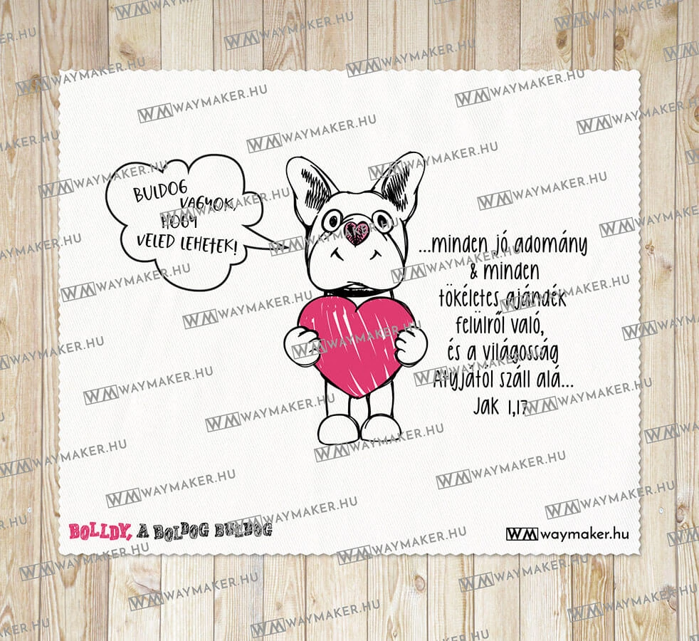 Felirat: „Buldog vagyok, hogy veled lehetek! – …minden jó adomány és minden tökéletes ajándék felülről való, és a világosság Atyjától száll alá… – Jak 1,17”.