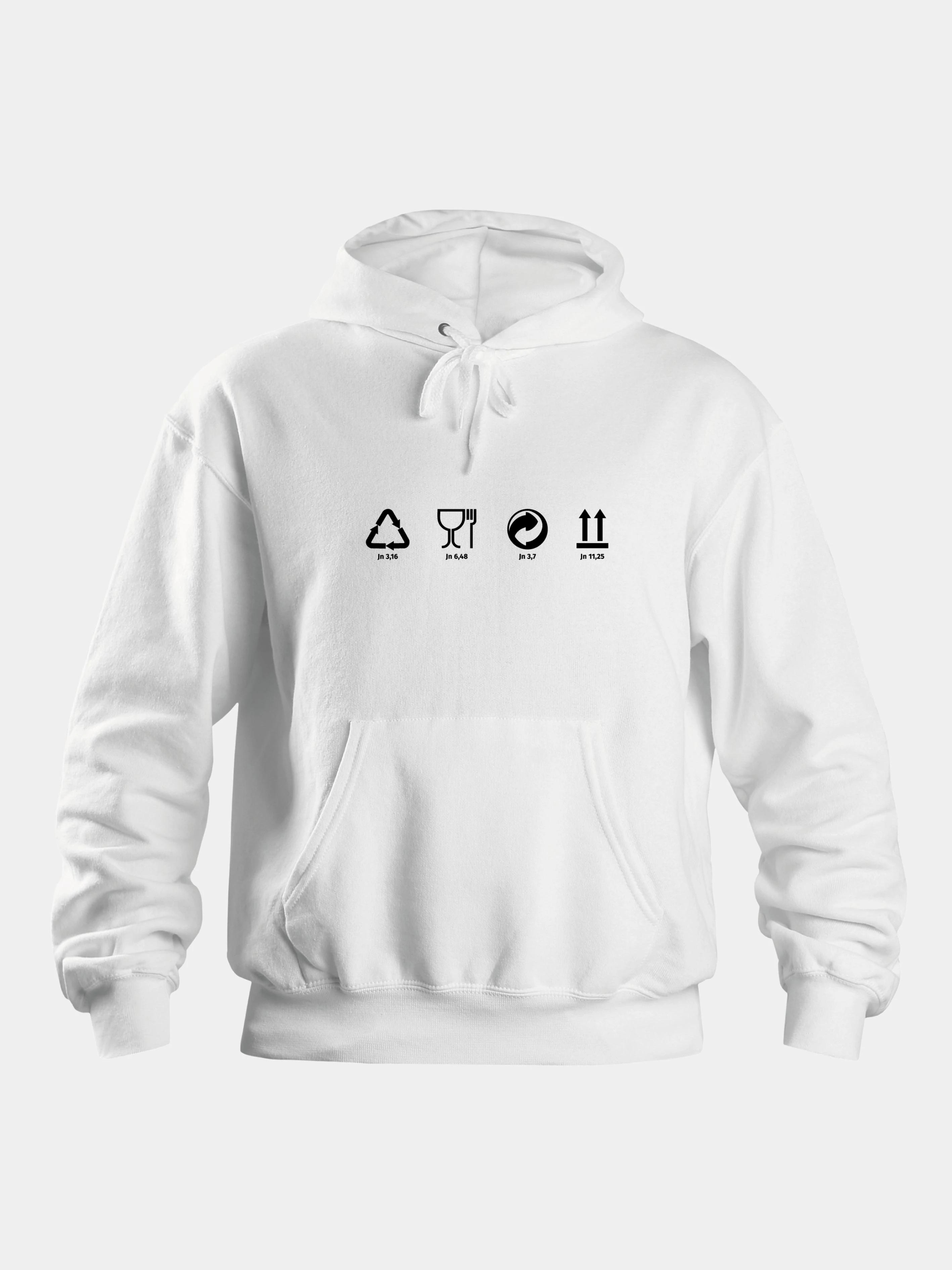 Kapucnis pulóver kenguruzsebbel, csomagolásikon-mintával, mindegyikhez 1-1 igehellyel.