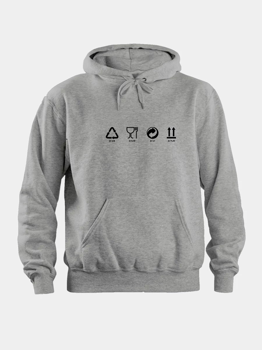 Kapucnis pulóver kenguruzsebbel, csomagolásikon-mintával, mindegyikhez 1-1 igehellyel.