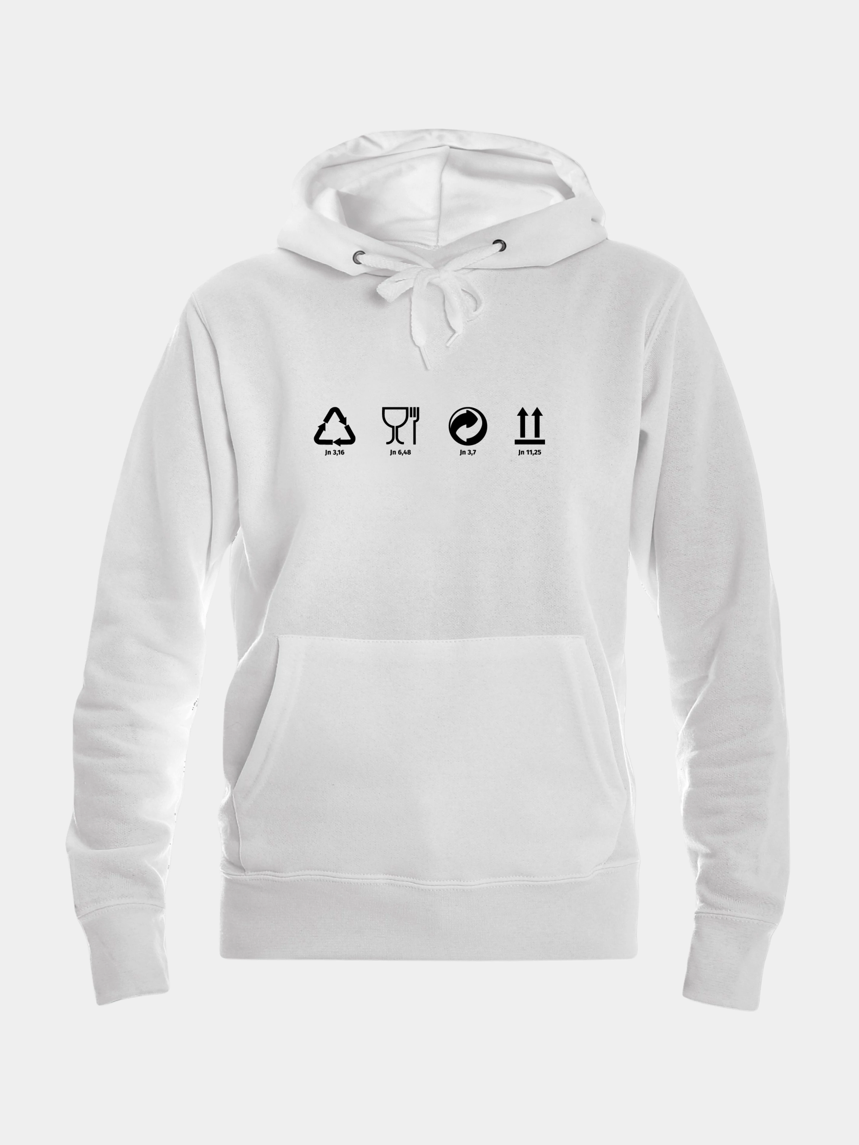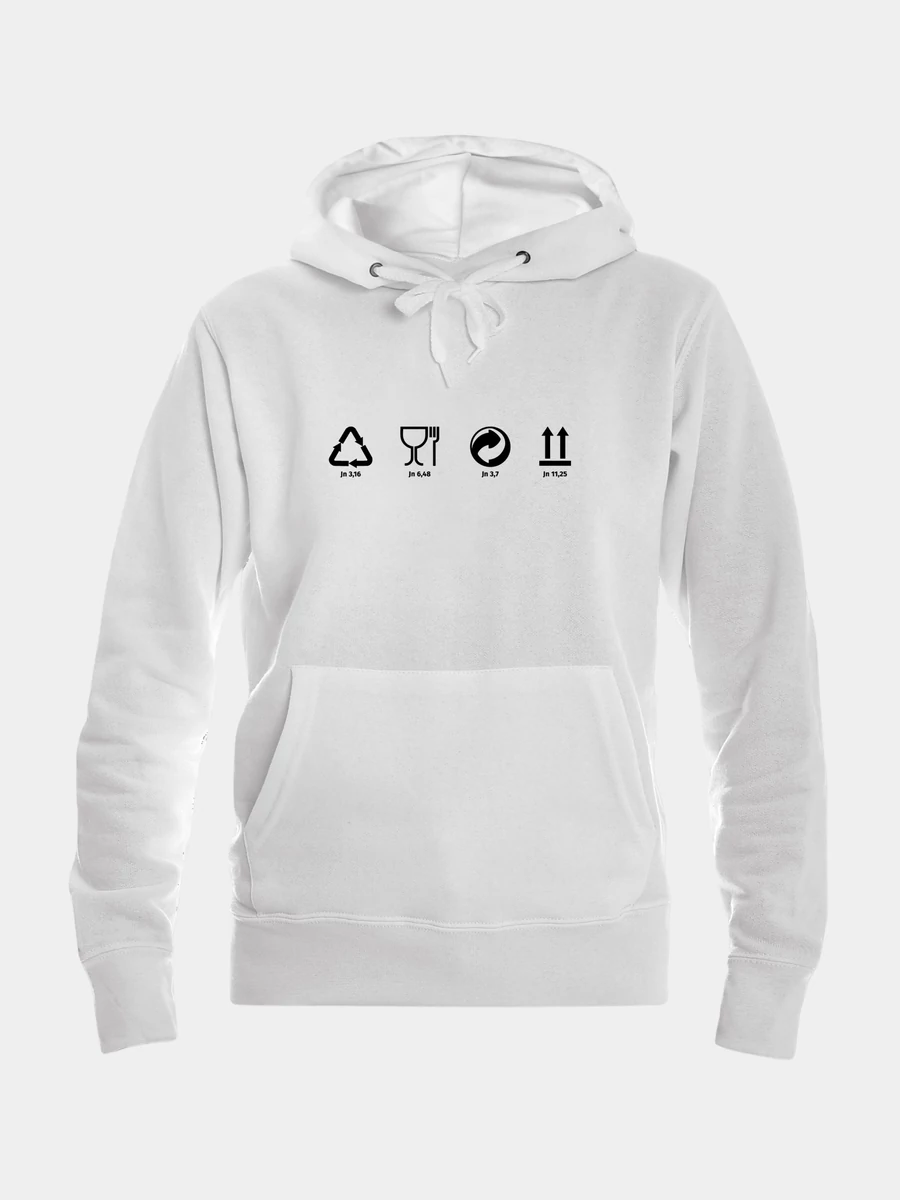 Női kapucnis pulóver kenguruzsebbel, csomagolásikon-mintával, mindegyikhez 1-1 igehellyel.