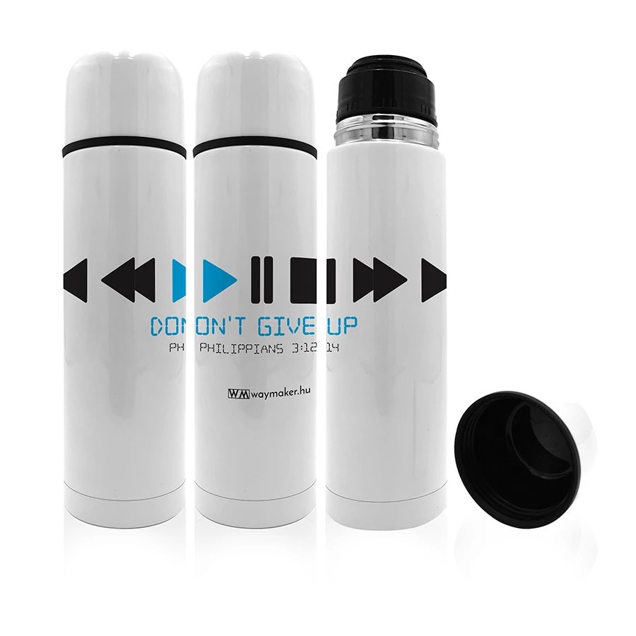 1 db rozsdamentes acél termosz, angol felirattal, mp3-kijelzőmintával.