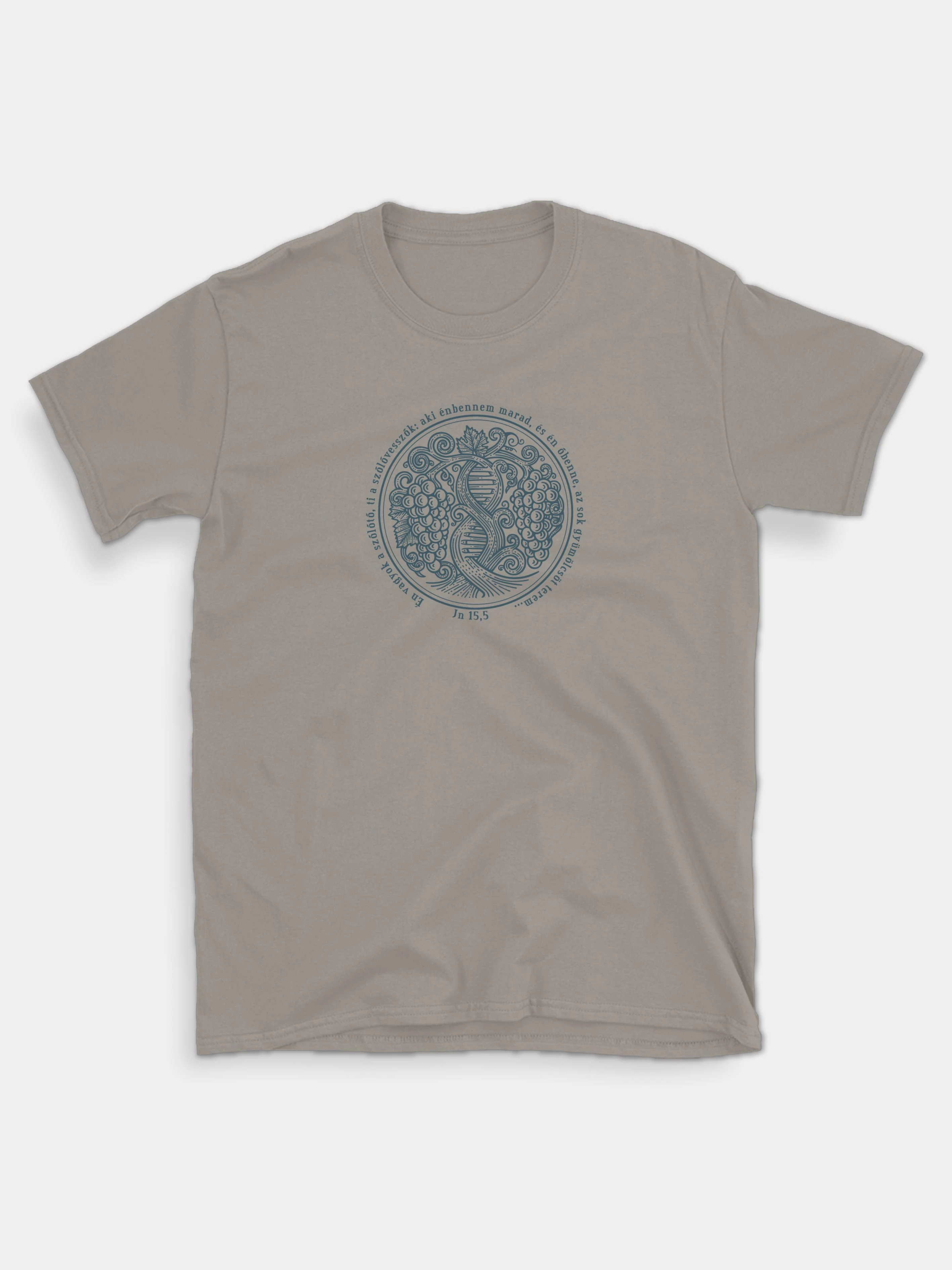 Felirat: „Én vagyok a szőlőtő, ti a szőlővesszők: aki énbennem marad, és én őbenne, az sok gyümölcsöt terem… Jn. 15,5”.