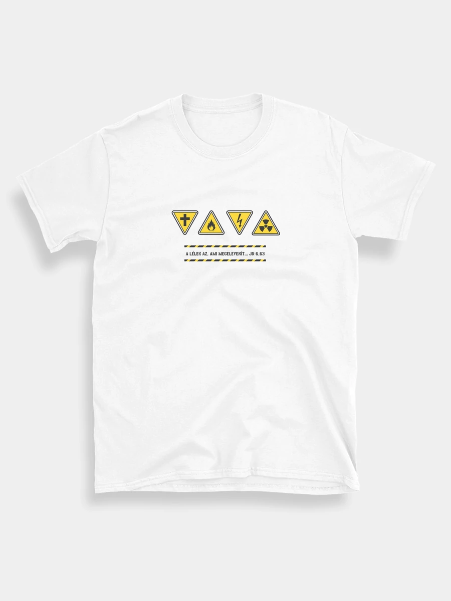Póló magyar felirattal, figyelemfelkeltő piktogramokkal.