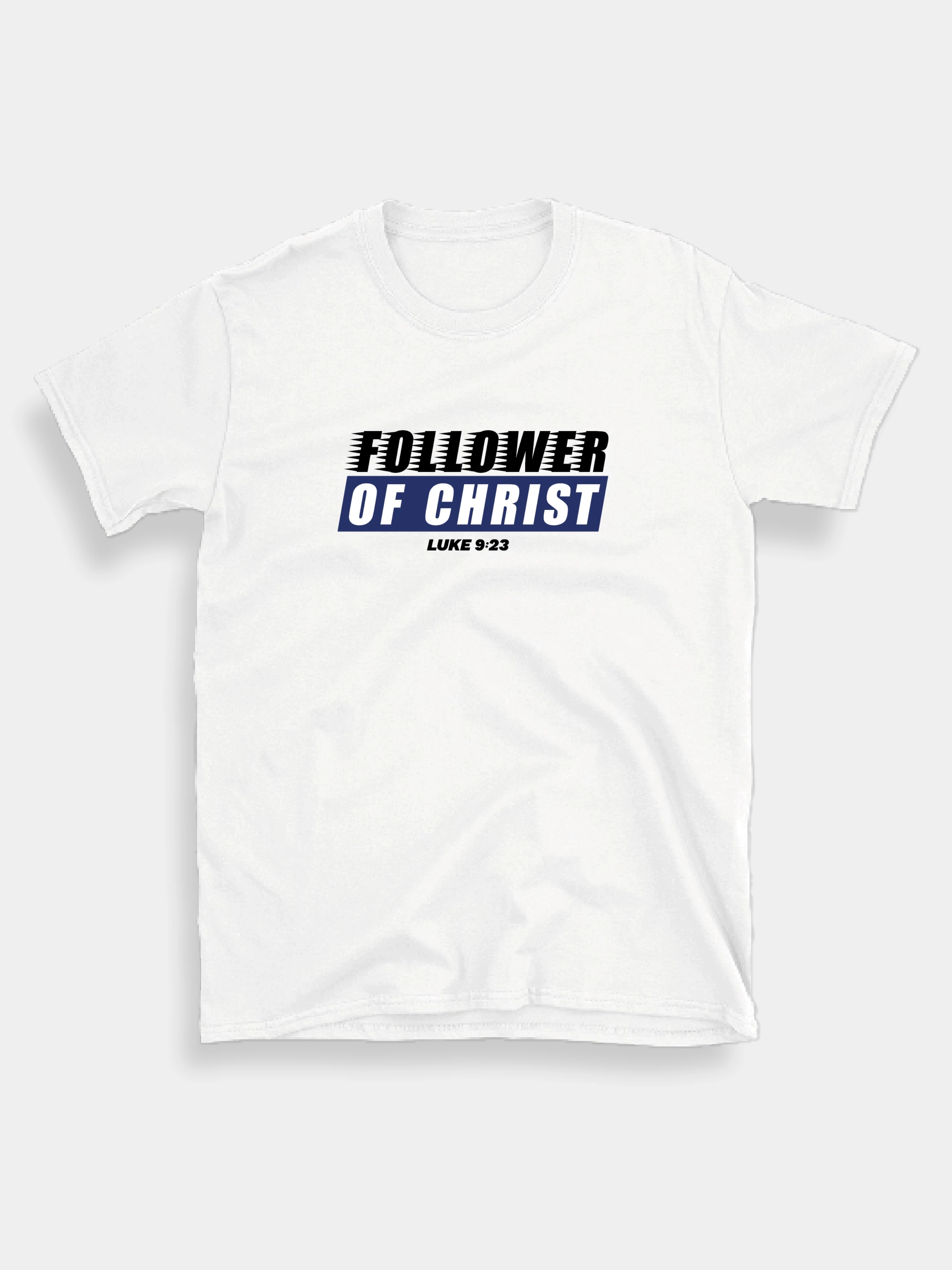 Felirat: „Follower of Christ – Luke 9:23”.