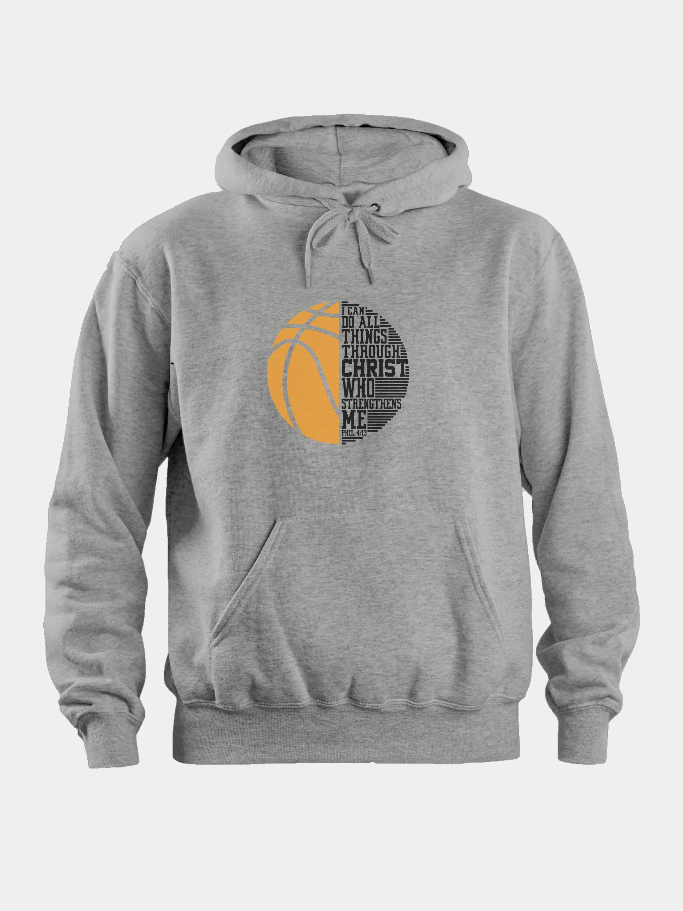 Uniszex kapucnis pulóver kenguruzsebbel, angol felirattal, kosárlabdamintával.