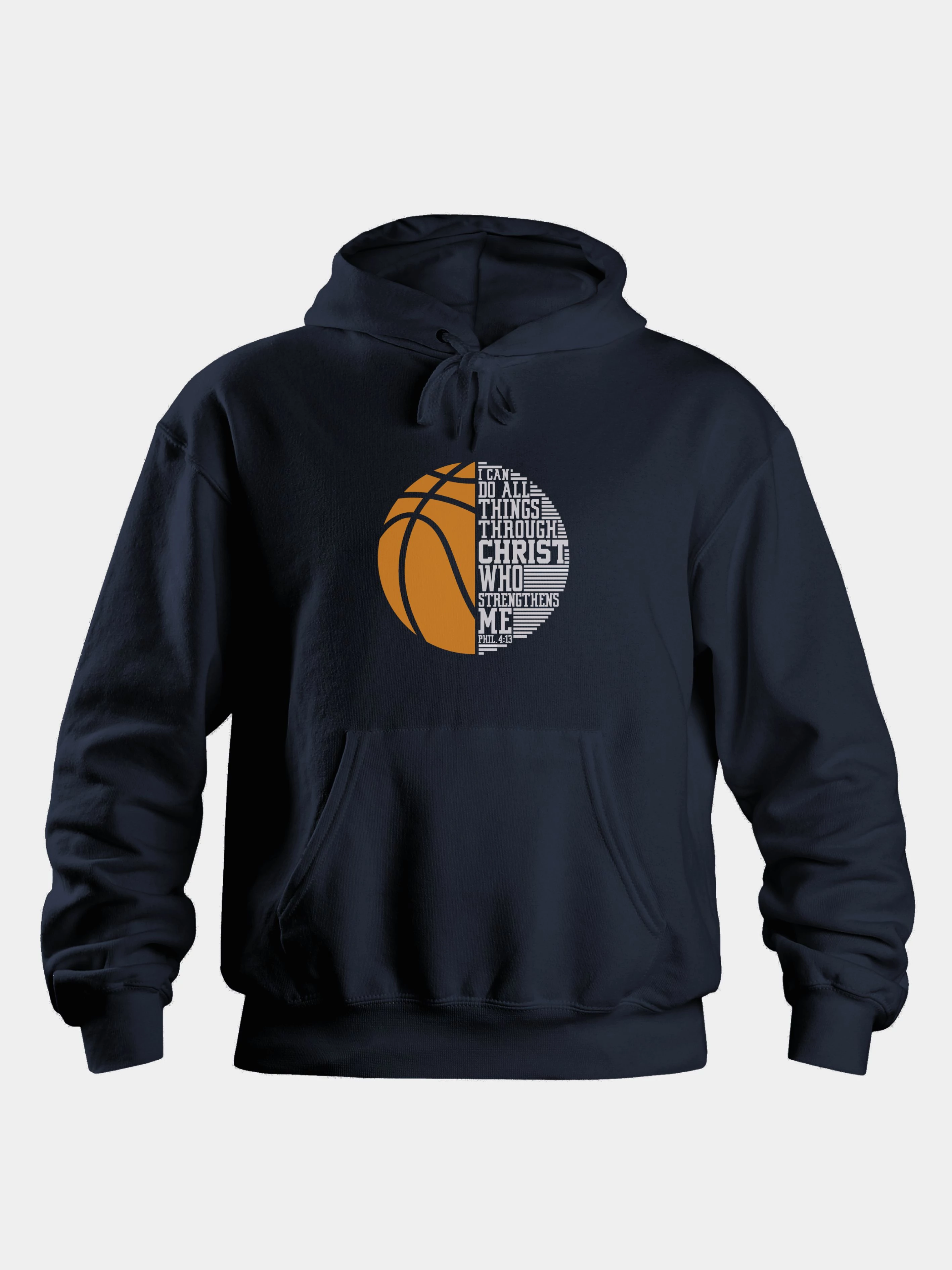 Uniszex kapucnis pulóver kenguruzsebbel, angol felirattal, kosárlabdamintával.