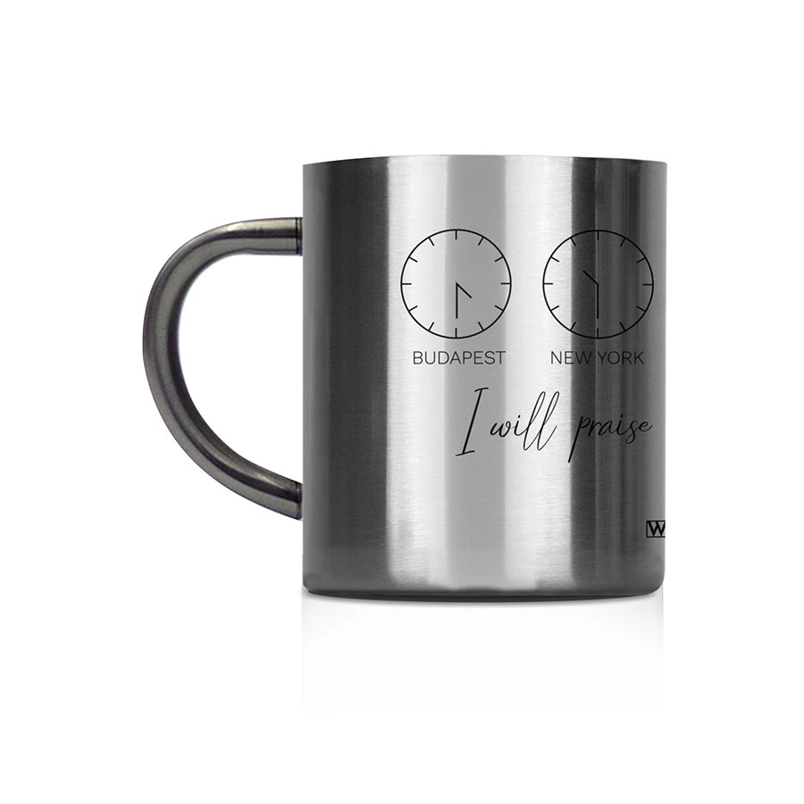 Fémbögre világóra mintával (Budapest, New York, London, Tokyo, Sydney). Felirat: „I Will Praise The Lord At All Times – Psalm 34:1”.
