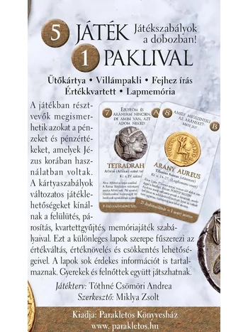 Bibliai játékkártya – ókori pénzekkel Társasjátékunk nemcsak izgalmas szórakozást nyújt, hanem sok hasznos információt is tartalmaz a Jézus korabeli pénzekről. A játék során a résztvevők megismerhetik azokat a pénzeket és pénzértékeket, amelyek Jézus idején használatban voltak. Találkoznak a pénzhez, vagyonhoz fűződő bibliai tanításokkal, és sok érdekes információval, valamint az ókori pénzek régészeti leletei alapján készült fotókkal. |