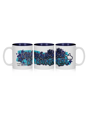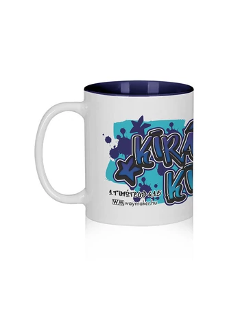 Kerámiabögre „Királyok Királya– 1Timóteus 6,15” felirattal, kék belsővel.