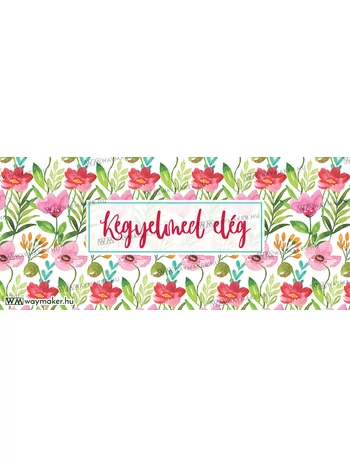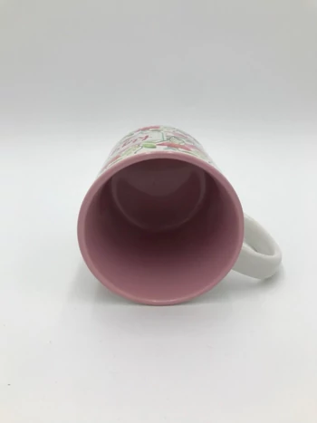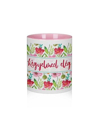 Kerámiabögre „Kegyelmed elég” felirattal, szép virágmintával, rózsaszín belsővel.