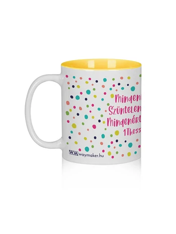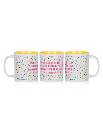 Kerámiabögre „Mindenkor örüljetek! Szüntelen imádkozzatok! Mindenért hálát adjatok...” 1Thesszalonika 5,16–18 felirattal, vidám sárga belsővel. Űrtartalom: 300 ml. E termék megvásárlásával 200 forinttal támogatod a Bibliák készítését. |