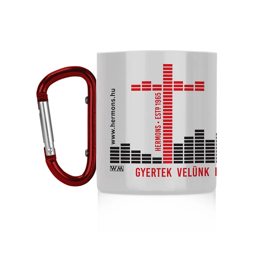 Hermons bögre piros karabinerrel. Felirat: „Gyertek velünk még ma énekelni és örülni”.