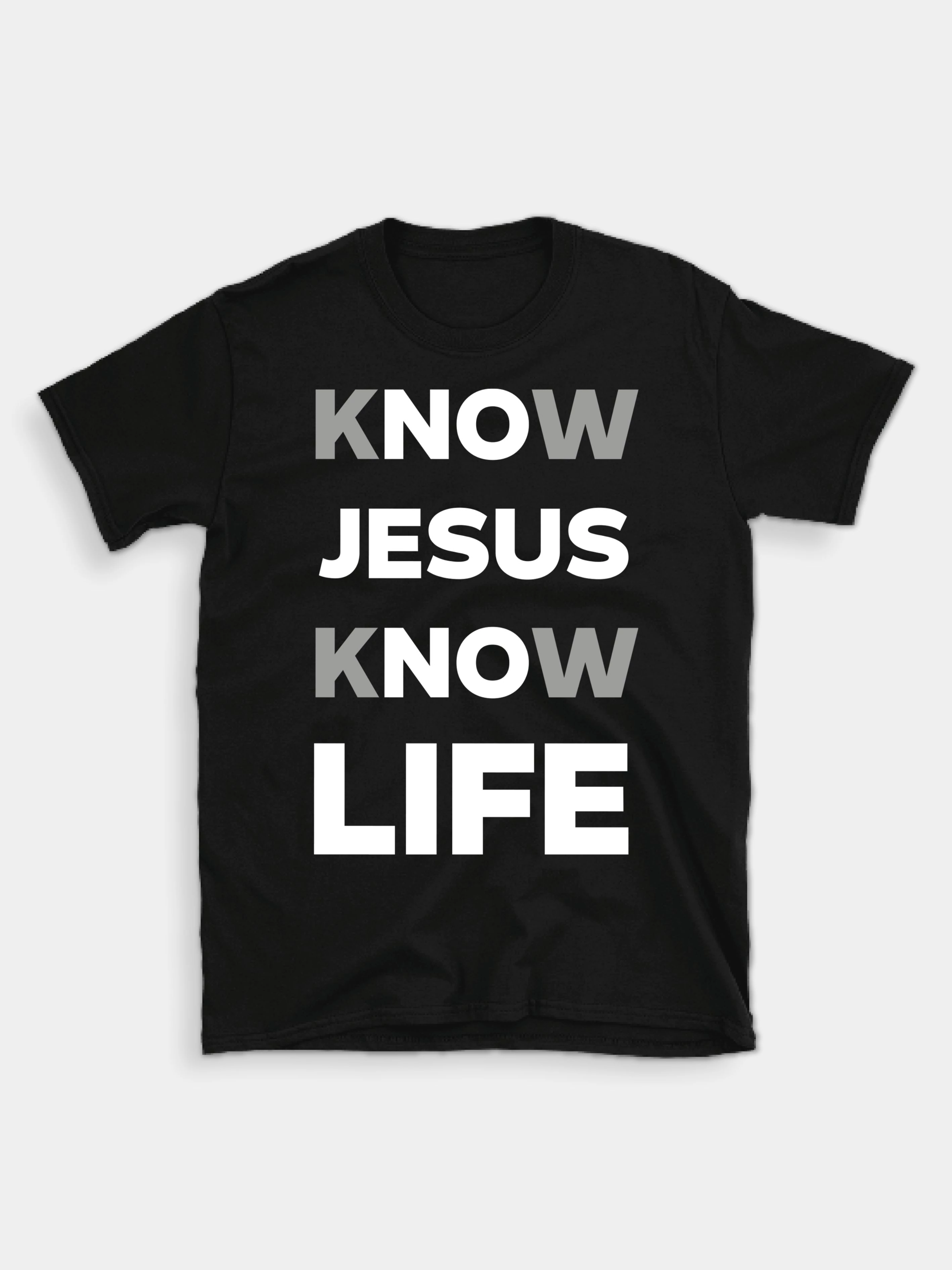 Magyarul nem könnyű visszaadni azt a szójátékot, amelyet ennek a pólónak a felirata rejt, de nagyjából így hangzik: „Ha ismered Jézust, ismered az életet – ahol pedig nincs Jézus, ott nincs élet sem.” Remek alkalom a tanúságtételre, ha ilyet viselsz.