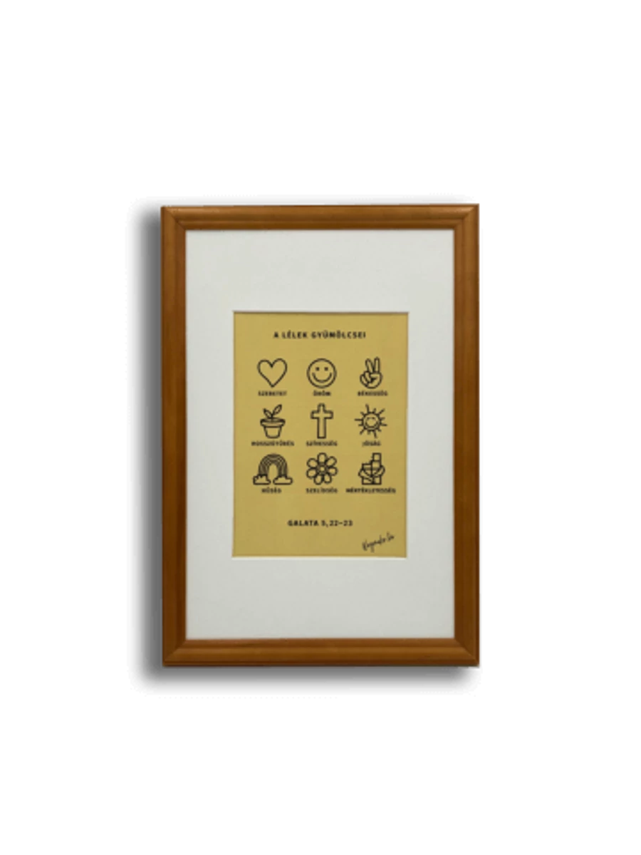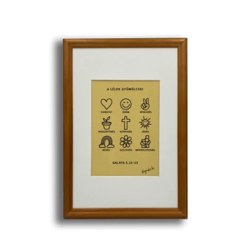 „A Lélek gyümölcsei” kép vidám szimbólumokkal. Felirata: „Szeretet, öröm, békesség, hosszútűrés, szívesség, jóság, hűség, szelídség, mértékletesség – Galata 5,22–23”.