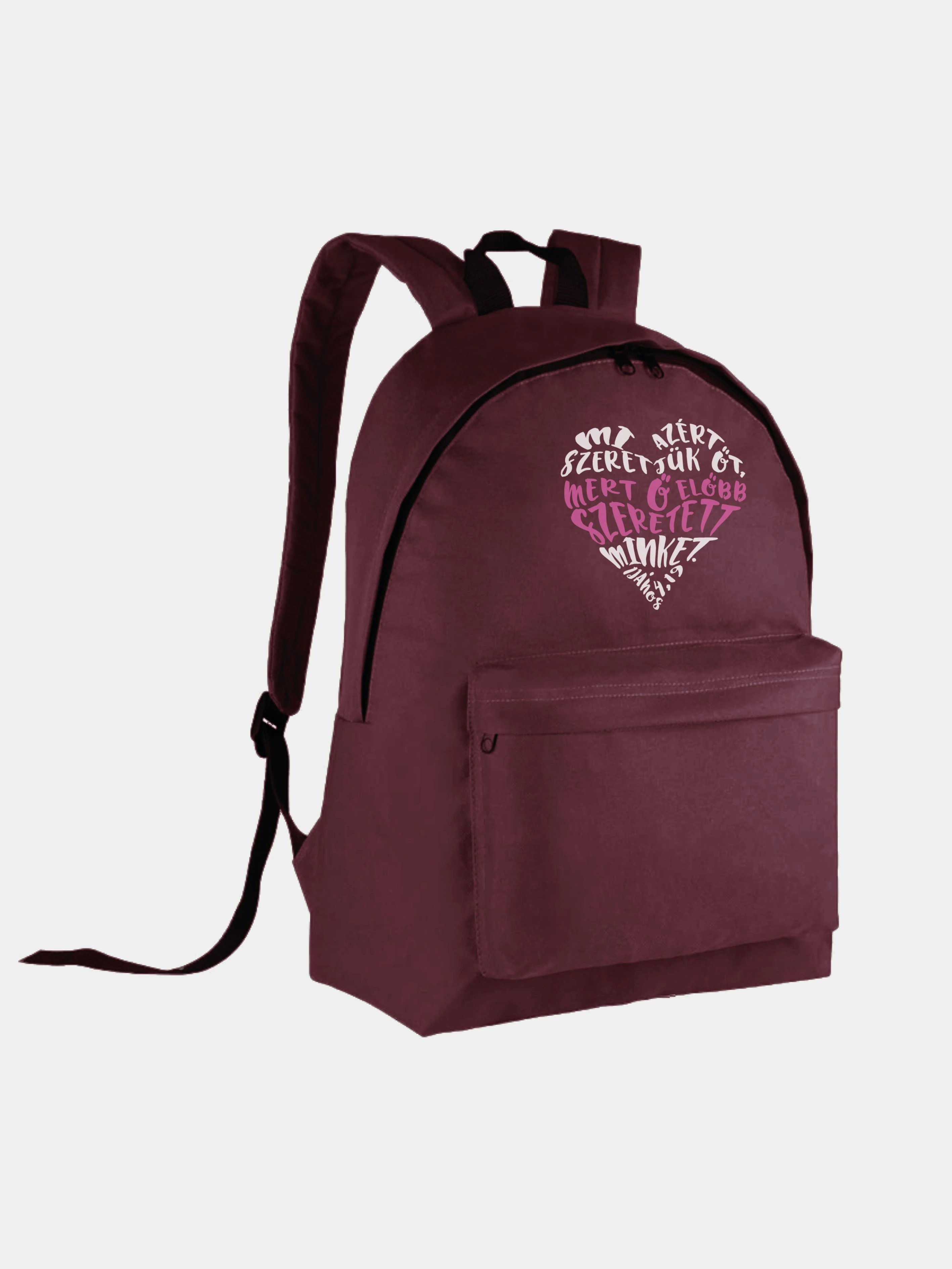 Cipzárazható elülső zsebbel. Bélelt hátoldallal és állítható, ergonomikus vállpánttal. A hátizsák mélysége magában foglalja az elülső zsebet.