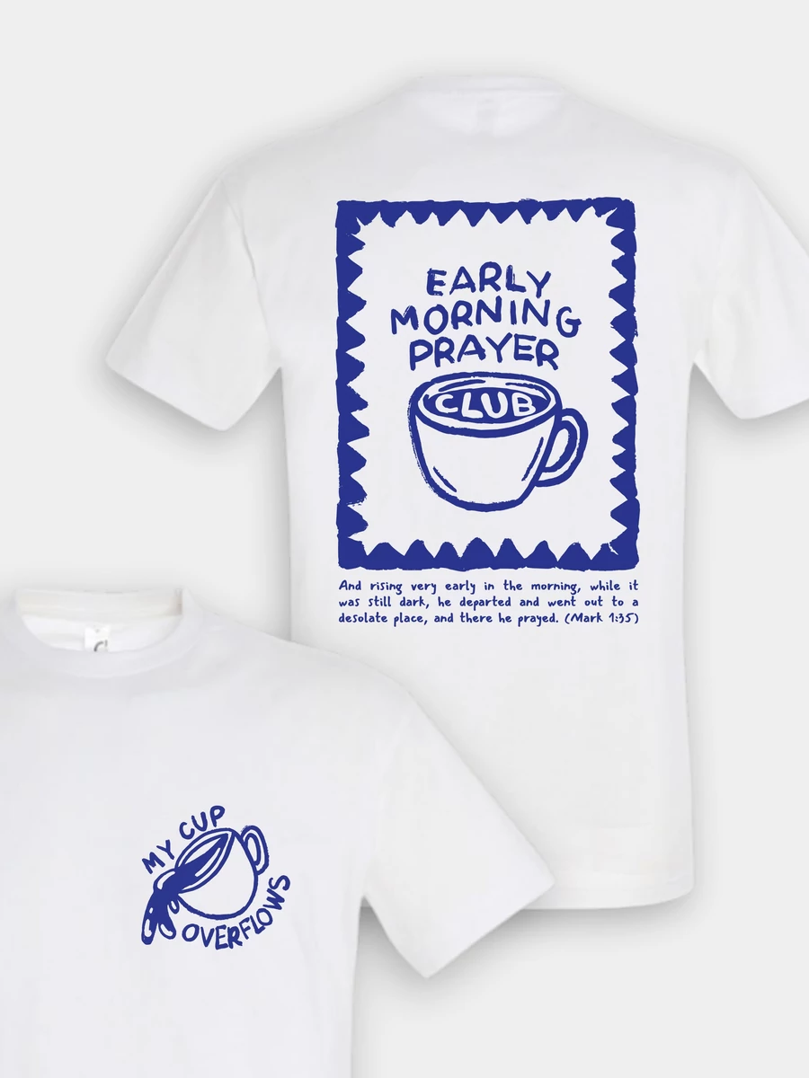 • póló hátulja: „Early Morning Prayer Club – And rising very early in the morning, while it was still dark, he departed and went out to a desolate place, and there he prayed. (Mark 1:35)”.