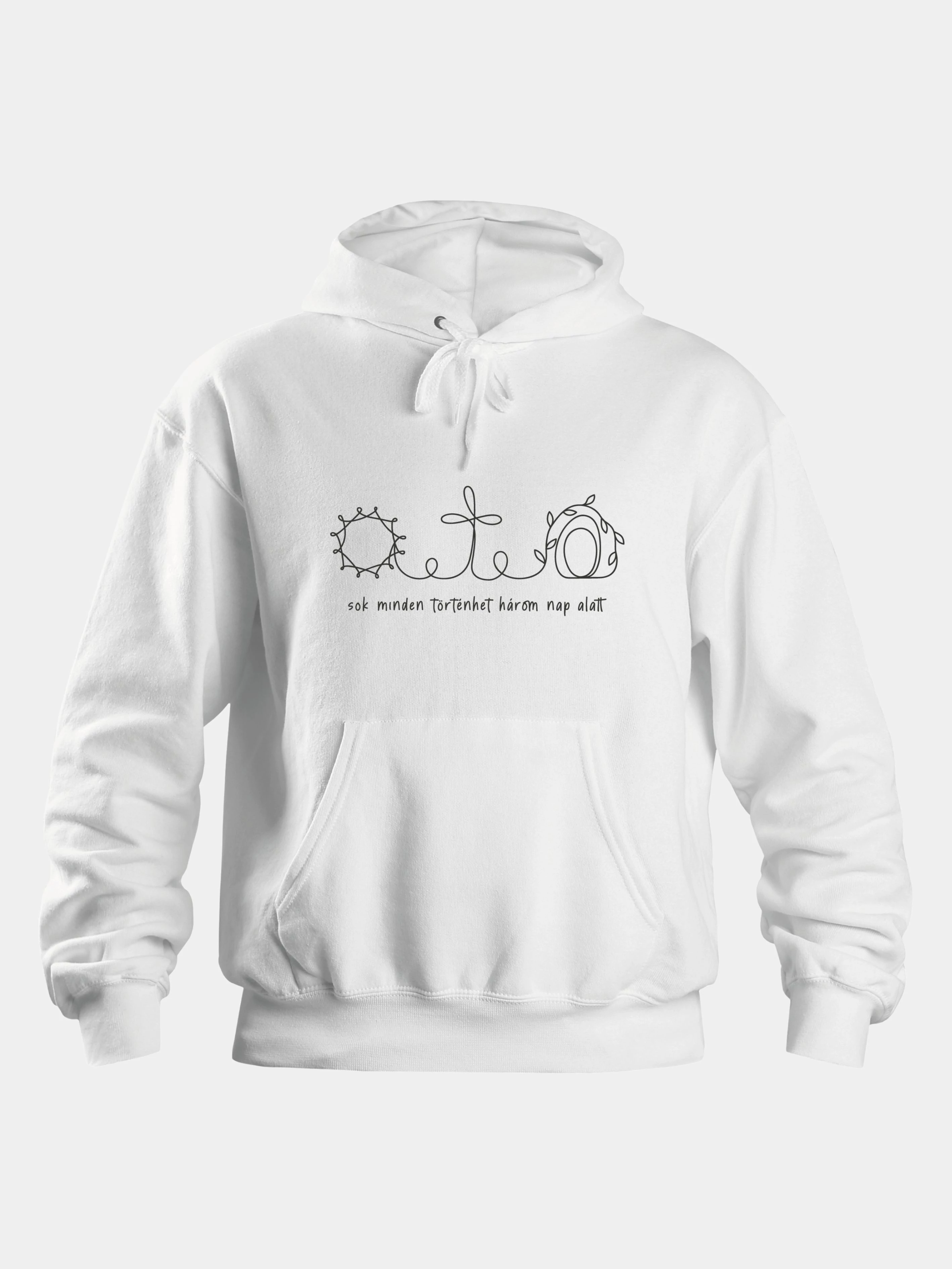 Kapucnis pulóver kenguruzsebbel, húsvéti mintával.