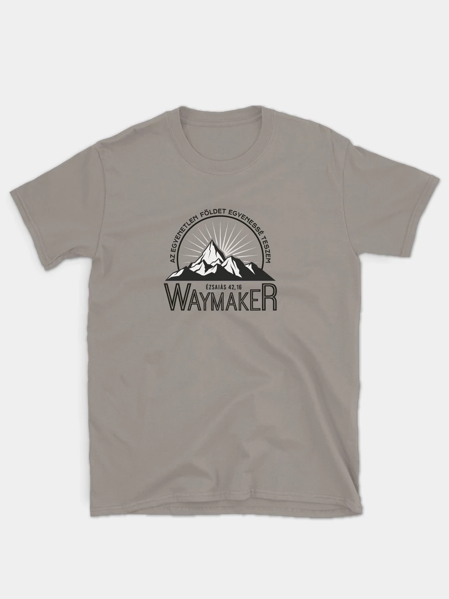 Felirat: „Az egyenetlen földet egyenessé teszem. Ézsaiás 42,16 – WAYMAKER”.