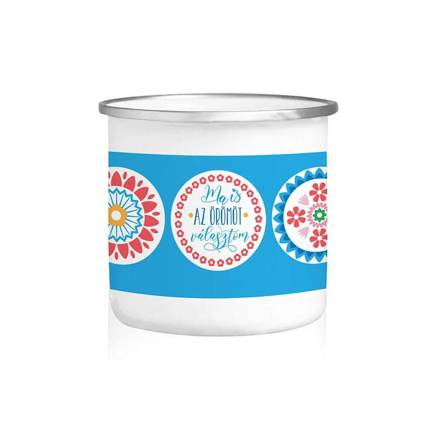 Reggelihez ajánljuk ezt a zománcozott bögrénket, „Ma is az örömöt választom” motiváló felirattal. Vidám mintájára pillantva bárki jókedvre derül. Napindítóként ajánld barátaidnak is!